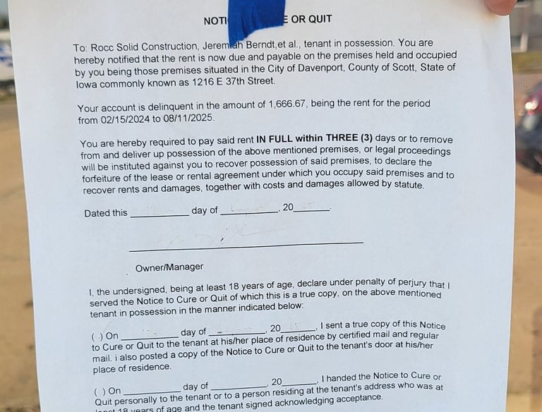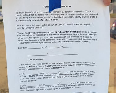 Further investigation revealed troubling signs about Rocc Solid Construction. An eviction notice was found on the door of their supposed office, indicating an outstanding balance owed. This raises questions about the company's financial stability and reliability.